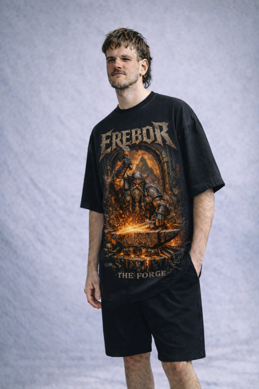 Nas profundezas da montanha, o aço ganha forma sob o som do martelo. A arte retrata um poderoso ferreiro anão trabalhando diante da forja incandescente enquanto faÃscas e metal derretido iluminam o interior da montanha. Inspirada no lendário reino anão de Erebor, presente no universo de O Senhor dos Anéis e O Hobbit, criado por J.R.R. Tolkien. A estampa celebra tradição, força e a arte ancestral de moldar armas e destinos através do fogo. A camiseta Super Oversized fio 30 é feita com 100% algodão e modelagem ampla. A estampa é aplicada em DTG (Direct To Garment). Cor da peça: Preto Tecido: 100% algodão fio 30 Modelagem: Super Oversized Estampa: Impressão DTG
